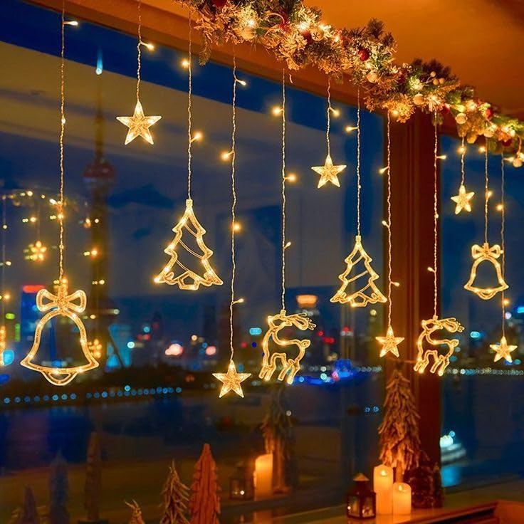 - Package Includes : 1-Piece, 3.5M Window Curtain LED Rice String Lights, 8 Flashing Modes, 5 Star, 2 Christmas Tree, 2 Bell and 2 Christmas Deer Light for Christmas Home Decorations, Festival Diwali