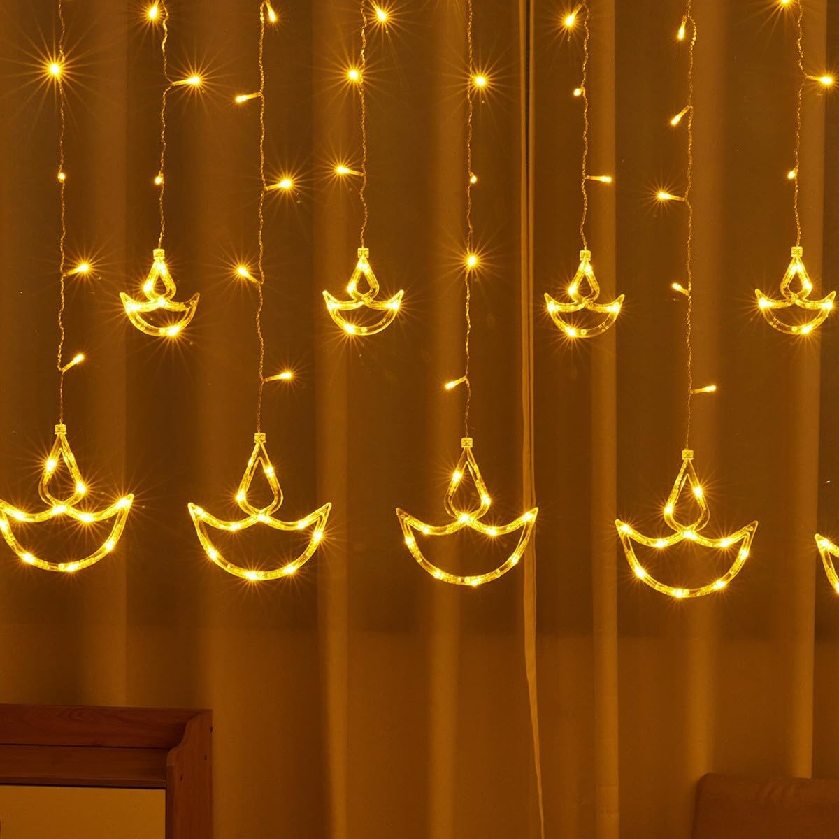 - Illuminate your celebrations with our stunning 12 Diya Curtain String LED Lights! Perfect for Diwali, festivals, weddings & home decoration. Features 3 meters length, 108 warm white LEDs, 8 dynamic lighting modes, and easy plug-in design. Create a magical ambiance with traditional diya shapes that emit a soft golden glow. Ideal for walls, windows, doorways & party decor. Transform any space into a festive wonderland with these energy-efficient decorative lights!