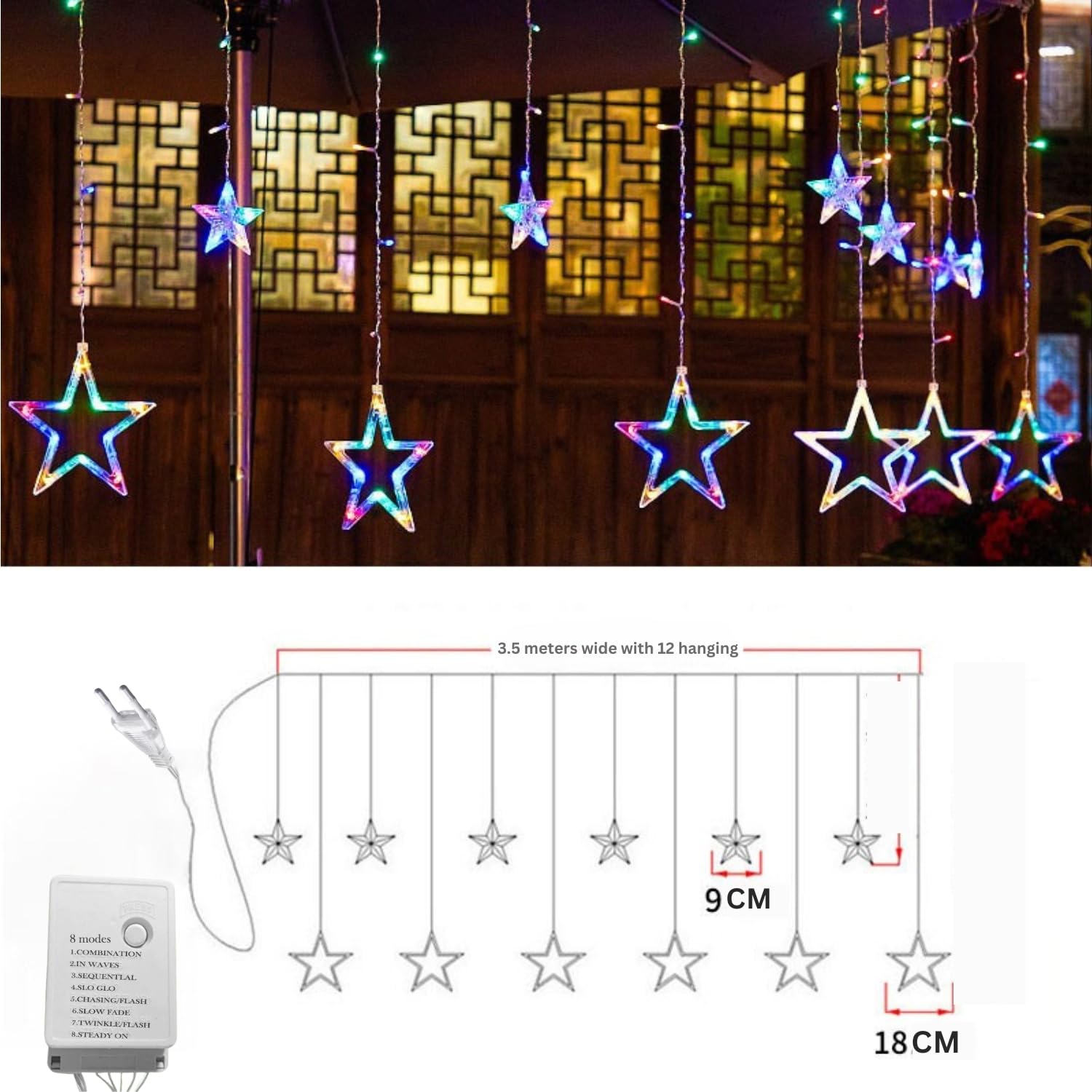 • Illuminate your celebrations with our stunning Star Curtain Lights featuring 108 multicolor LEDs in a 3-meter design with 12 beautiful stars. Perfect for Diwali, Christmas, weddings, and home decoration. Energy-efficient, safe, and easy to install. Create magical ambiance for any occasion with these versatile decorative lights. Ideal for indoor and covered outdoor spaces. Transform your space instantly with vibrant, eye-catching illumination!
