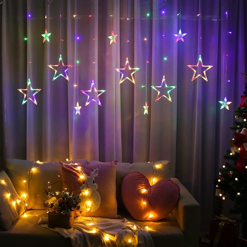 Create a magical ambiance with our premium Star Curtain Lights featuring 108 vibrant multicolor LEDs arranged in a beautiful 3-meter curtain design with 12 decorative stars. Perfect for adding a festive glow to any celebration or everyday home décor.